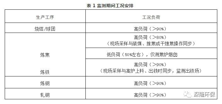 1.監(jiān)測點位和因子。主要監(jiān)測鋼鐵企業(yè)超低排放指標限值表中規(guī)定的污染源污染物濃度,以及煙氣參數(shù)(溫度、濕度、流速、含氧量、壓力等)。對相同規(guī)模裝置、相同類別污染源可選取一個有代表性的污染源開展監(jiān)測,如軋鋼熱處理爐中,同種燃料類型的加熱爐或退火爐可選擇其中一個爐子開展現(xiàn)場手工監(jiān)測。2.監(jiān)測時間和頻次。燒結(jié)機機頭、球團焙燒煙氣、焦爐煙囪廢氣等排放口監(jiān)測至少 3 天或一個生產(chǎn)周期,其他排放口監(jiān)測至少 1 天。監(jiān)測期間,企業(yè)在線監(jiān)測設(shè)施不得進行計劃外的調(diào)試,同時開展 CEMS 現(xiàn)場比對。二氧化硫、氮氧化物每天至少連續(xù)采樣監(jiān)測 1 小時,或等時間間隔采樣獲得具有代表性的污染物濃度小時均值,并保證至少有 9 個實際樣品;顆粒物至少采集 3 個實際樣品。3.監(jiān)測工況及現(xiàn)場監(jiān)測記錄。監(jiān)測期間工況安排見表 1。監(jiān)測同時記錄各主要生產(chǎn)工序產(chǎn)品日產(chǎn)量、出鐵出鋼狀態(tài)、采用原燃料種類和比例等基本信息,主要原燃料含硫率、低氮燃燒、煙氣循環(huán)、煤氣精脫硫等源頭減排技術(shù)采用情況,燒結(jié)機機頭煙氣、球團焙燒煙氣、焦爐煙囪廢氣等主要污染源脫硫、脫硝、除塵污染控制措施。